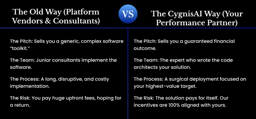 Generic AI platforms promise the world but deliver complexity. We deliver guaranteed financial and ESG results. Our model is simple: we deploy our expert-architected AI to solve your process challenge, and our fee is a fraction of the new profit we generate for you.